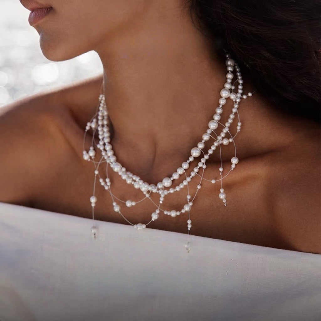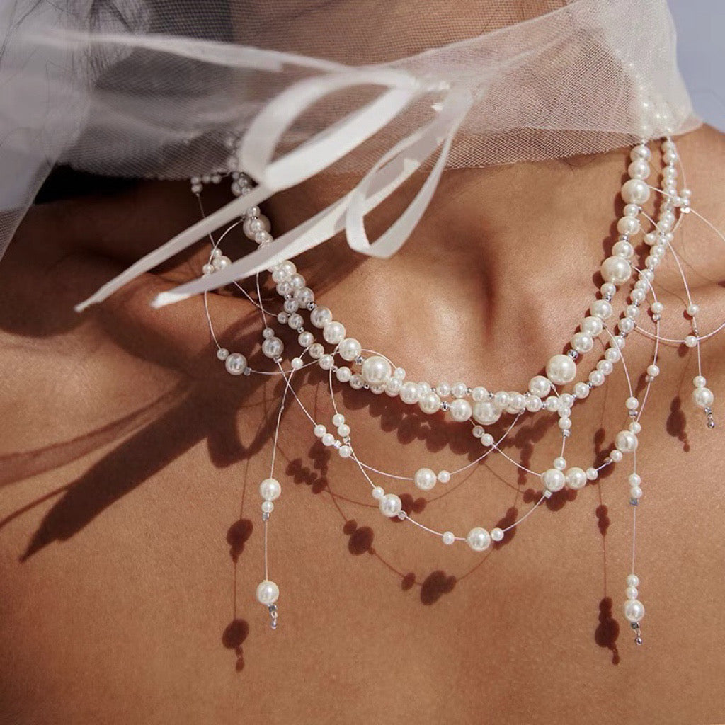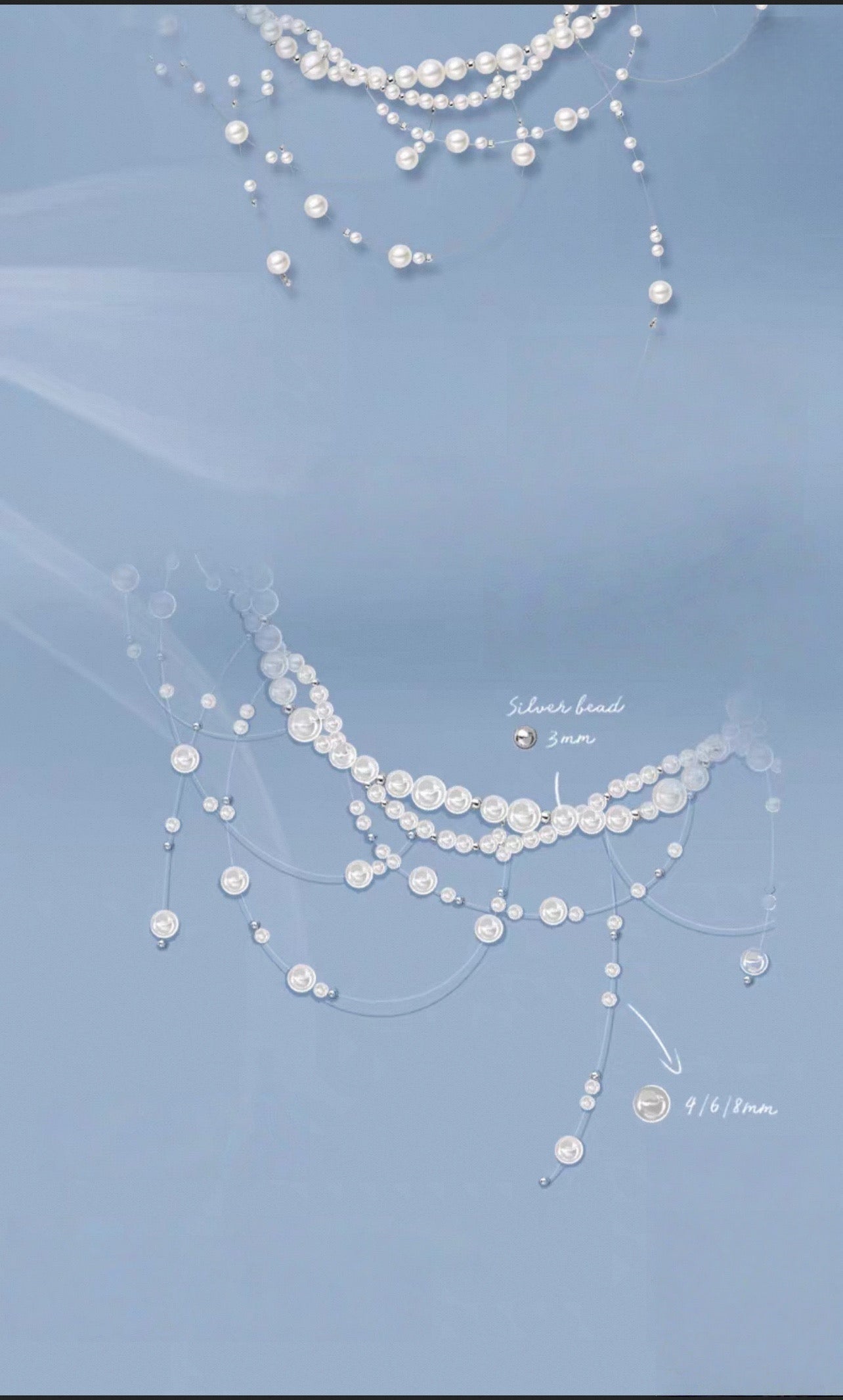 Celestial Poetry:A swirling nebula of lustrous pearls drapes your décolletage, capturing starlit magic.