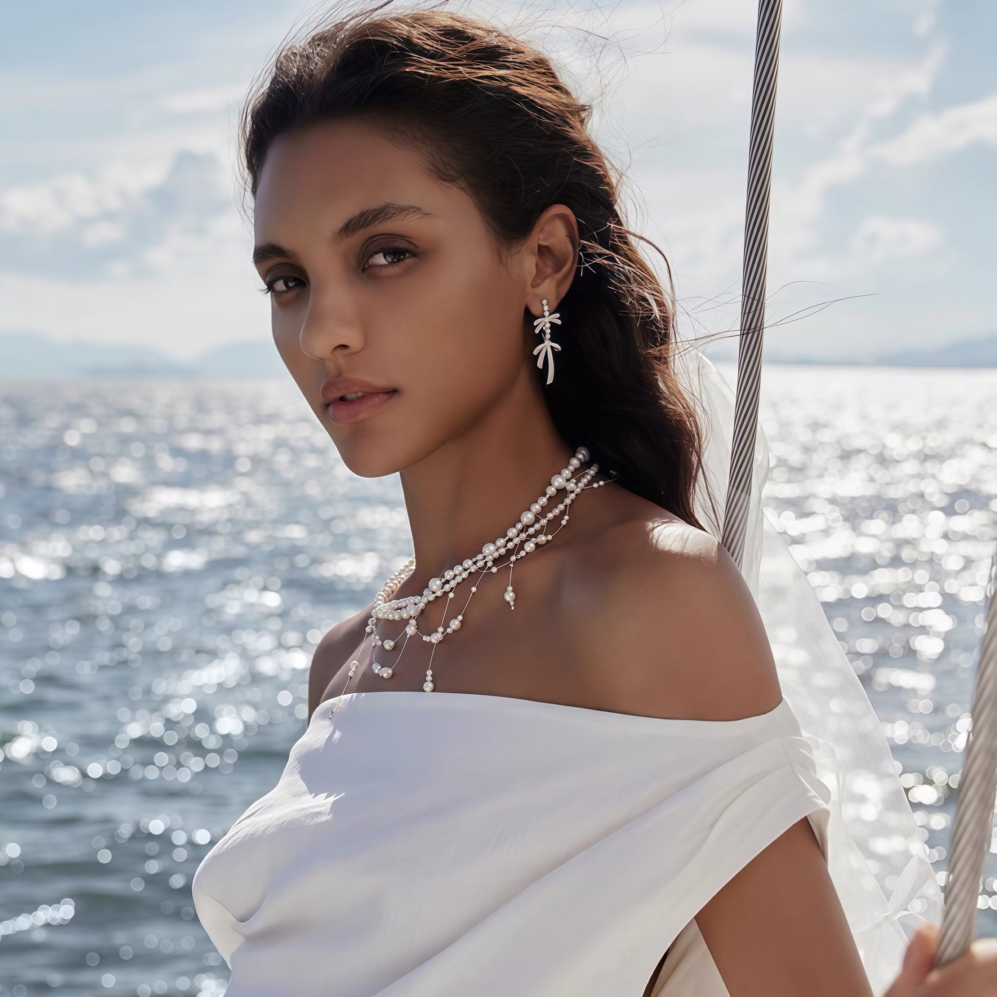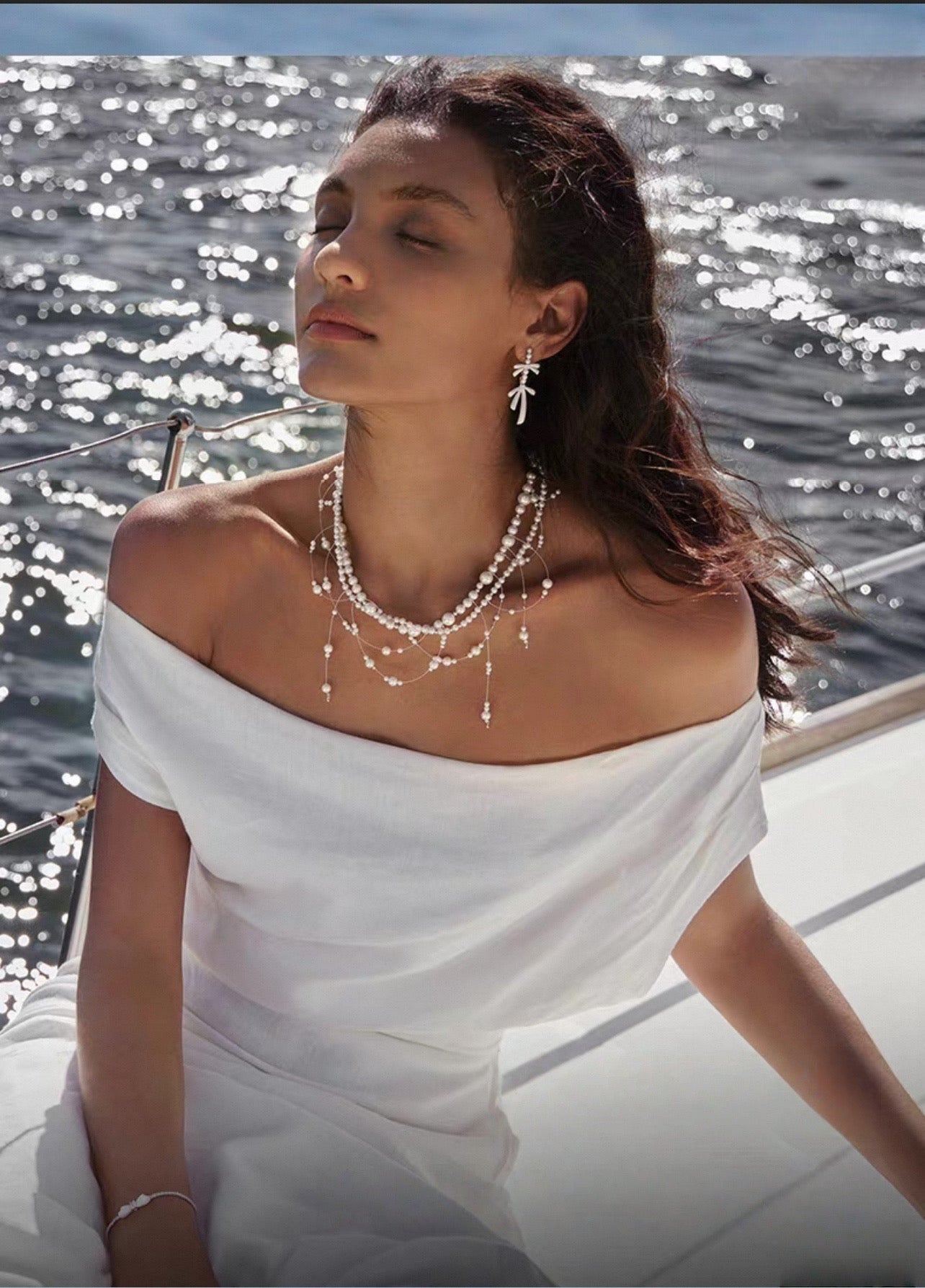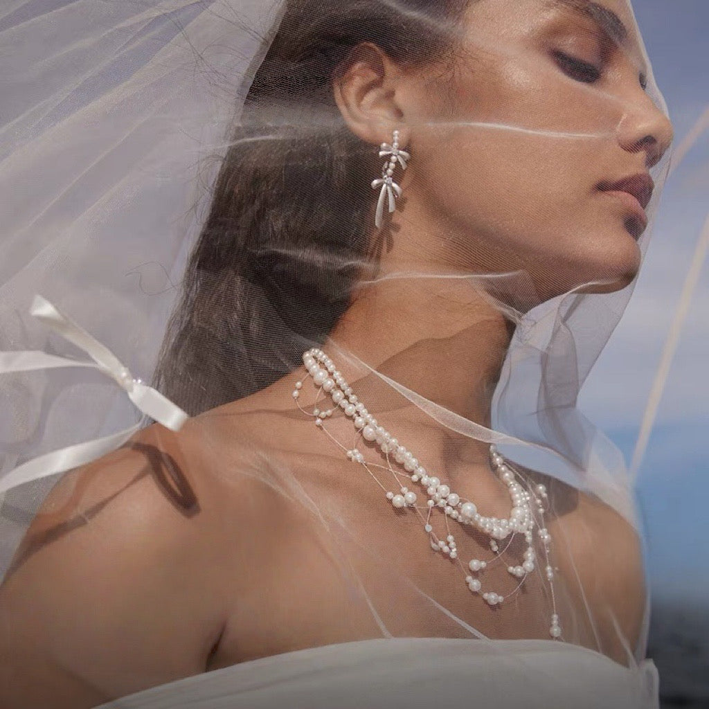 Celestial Poetry:A swirling nebula of lustrous pearls drapes your décolletage, capturing starlit magic.